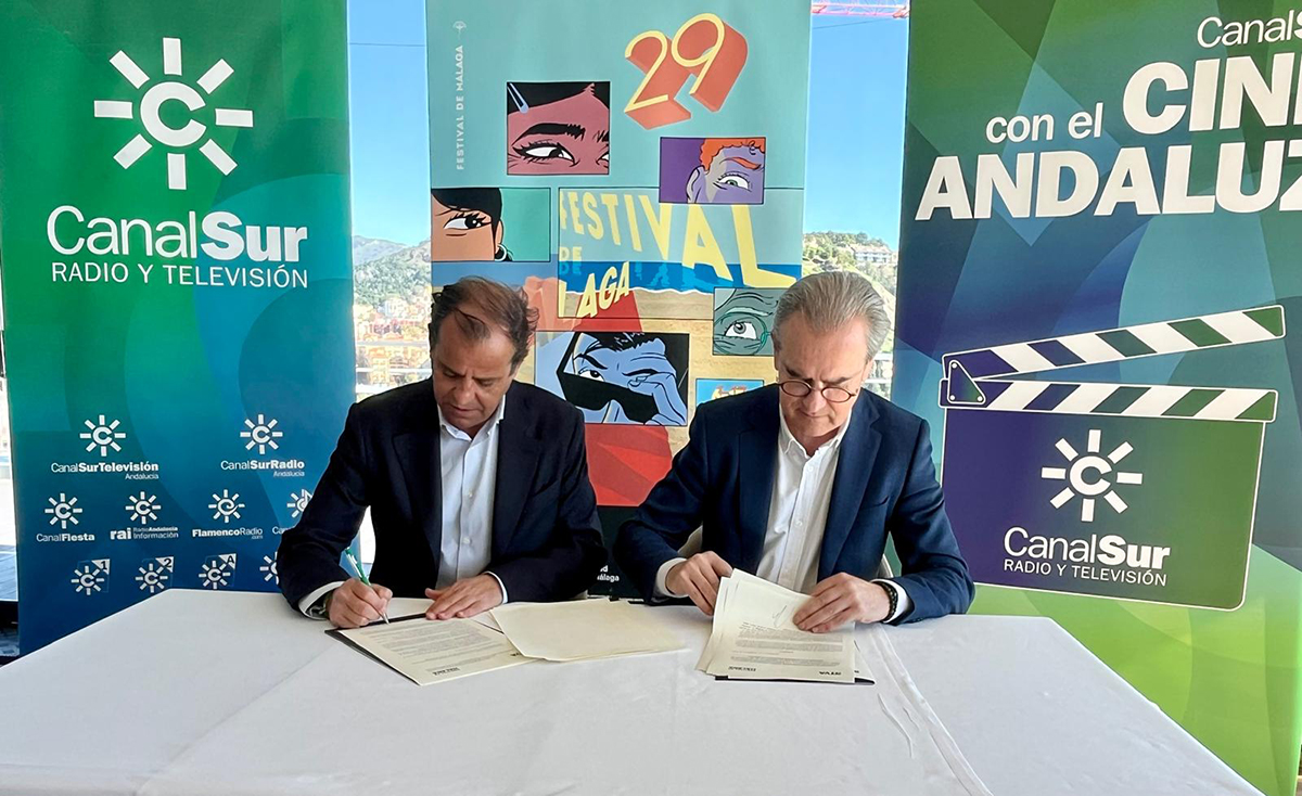 El director general de Canal Sur, Juande Mellado, y el director del Festival de Málaga, Juan Antonio Vigar, han firmado un convenio de colaboración de la 29 edición